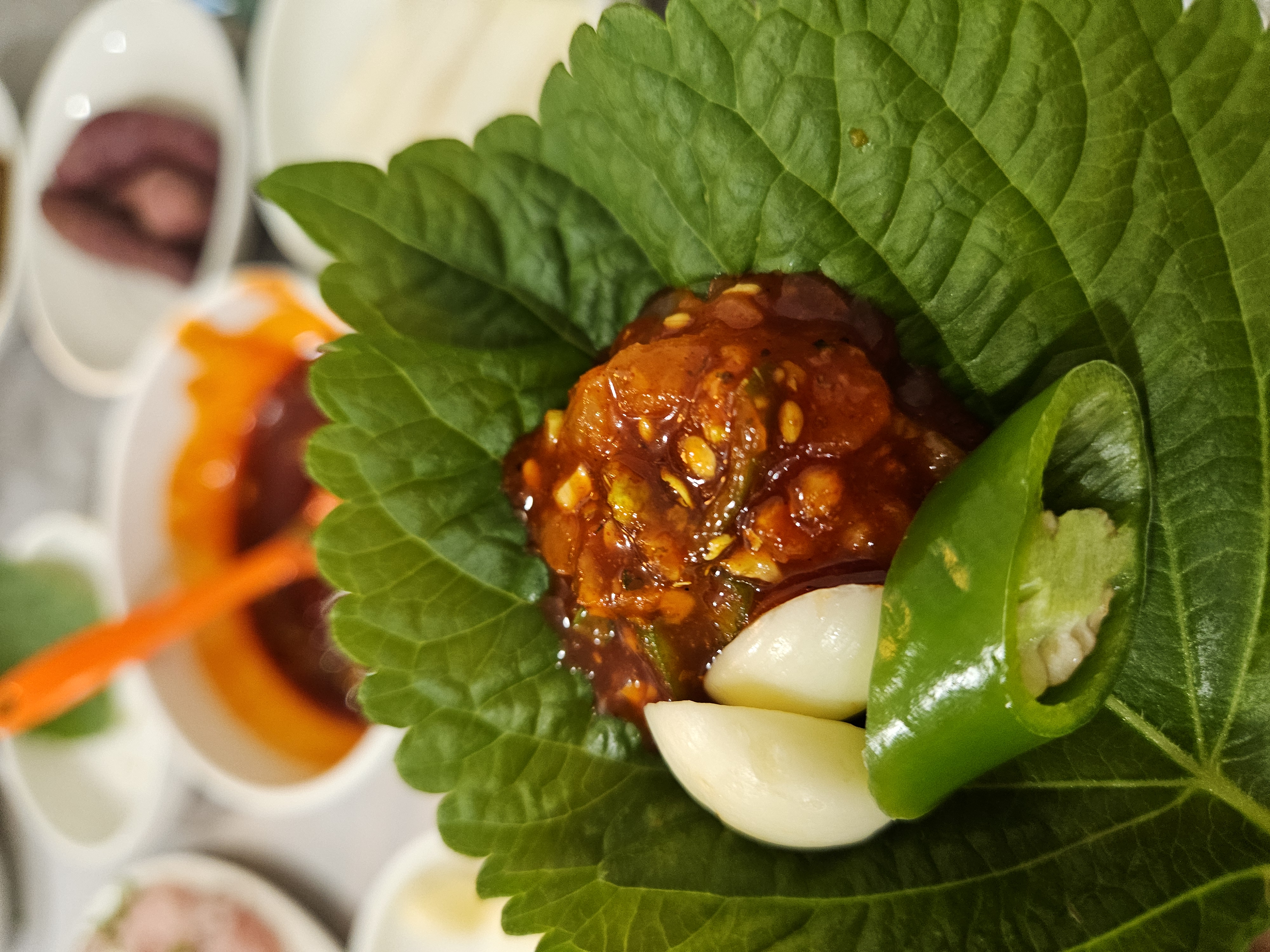 초장 듬뿍 찍어서 마늘과 땡초 올려 한쌈 싸 먹으면 단맛이 입안을 가득 채웁니다.